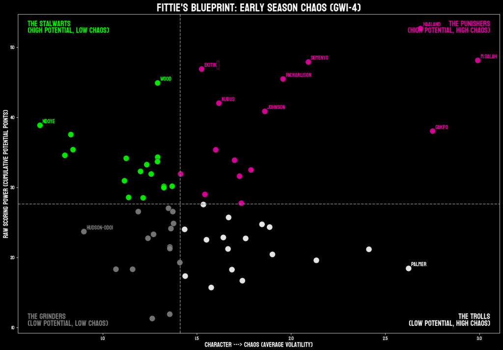 - Character –> Chaos (X-Axis): This is a player’s average Volatility Score from GW1-4. The further to the right, the more chaotic and unpredictable their scoring has been. Players to the left exhibit more consistent (less chaotic) early-season returns.