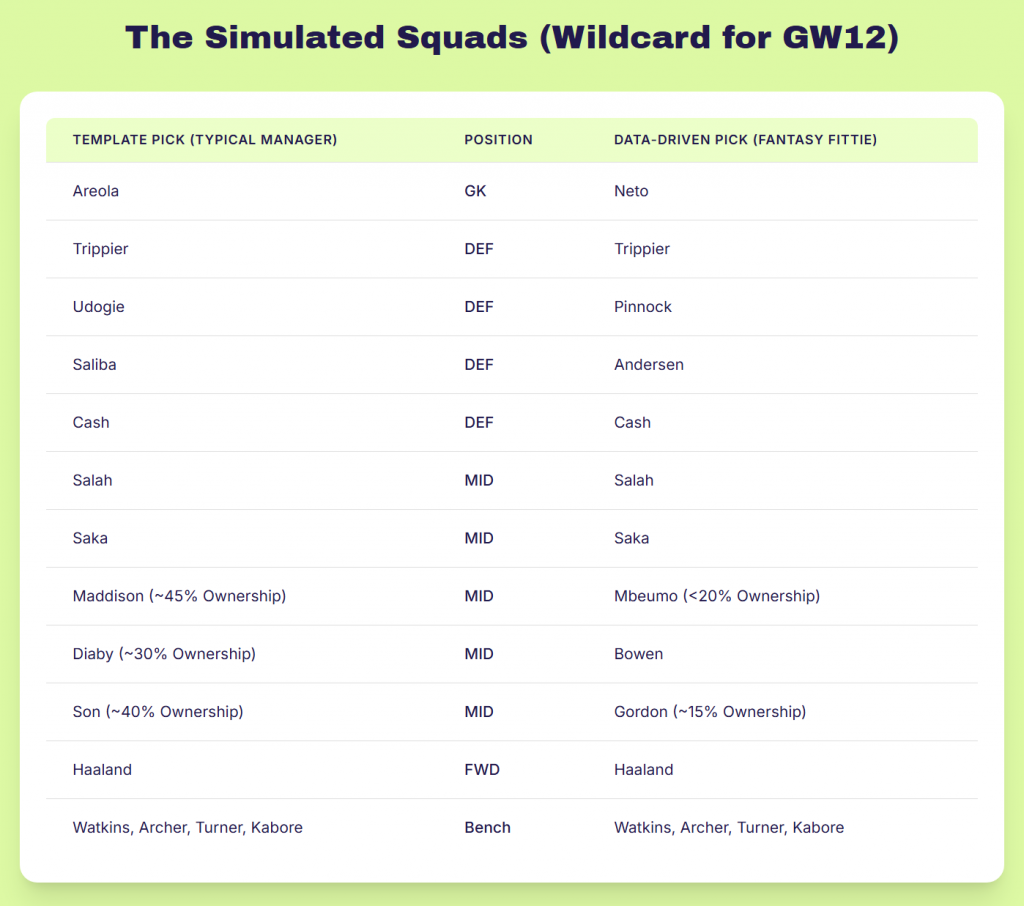 Let’s run the simulation for a GW12 Wildcard. The typical manager, influenced by groupthink, builds a “template” squad. We build based on the numbers.